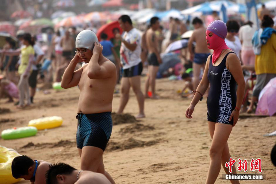 A 'facekini' dama prepares to go to swim in the sea, July 20, 2010. (China News Service/Xu Chongde)