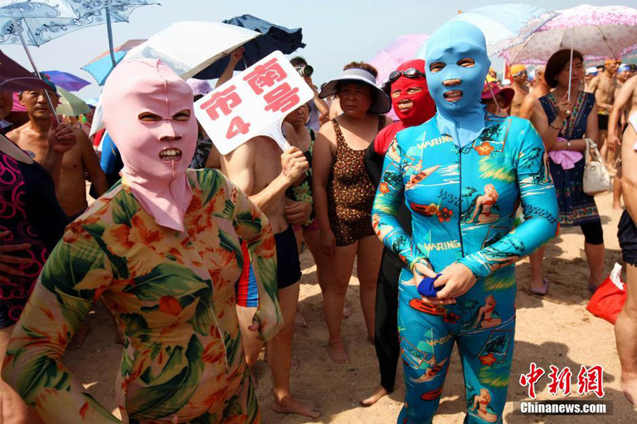 'Facekini' damas participate in a seaside tourism activity in Qingdao, Aug. 8, 2013. (China News Service/Xu Chongde)