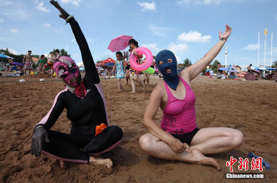 Two 'facekini' damas are doing exercises before go to swim in the sea, Aug. 2, 2014. (China News Service/Xu Chongde)