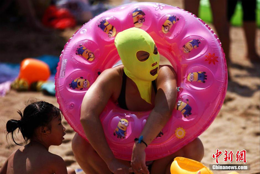 A 'facekini' mom sits with her daughter, Aug. 8, 2014. (China News Service/Xu Chongde)