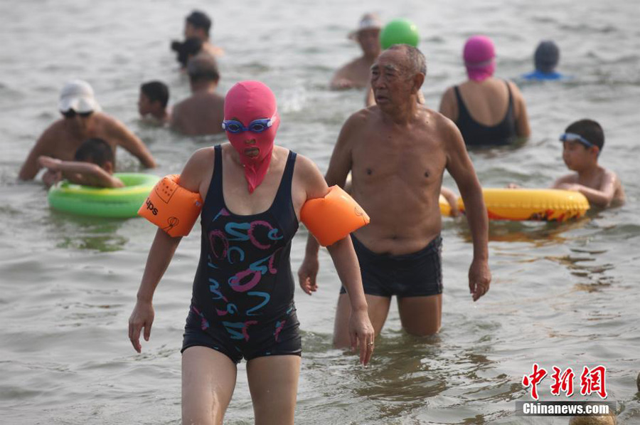 A 'facekini' dama goes on shore, July 20, 2010. (China News Service/Xu Chongde)