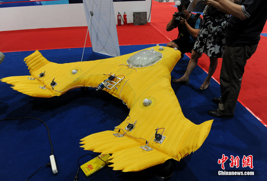 An inflatable aircraft meets the public at Tianjin International UAV Exhibition on Aug. 29 2014. Inflatable aircraft is the aircraft without rigid skeleton. Comparing with normal aircraft, it has big load capacity, good flexibility and high impact resistance. It can be used for low speed and low altitude navigation, aerial survey and remote sensing. (CNS/Chen Haifeng)