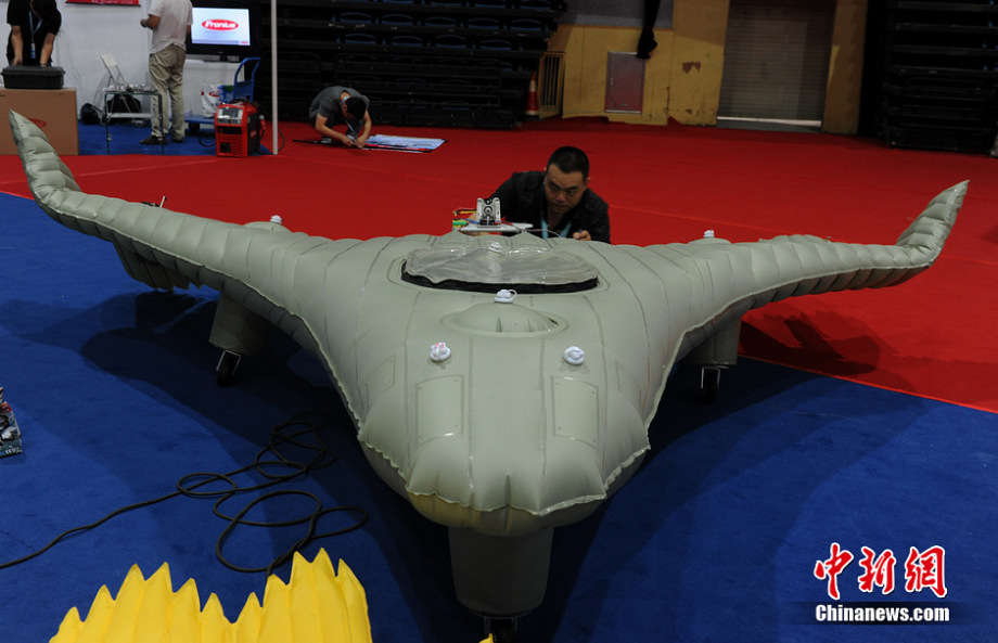 An inflatable aircraft meets the public at Tianjin International UAV Exhibition on Aug. 29 2014. Inflatable aircraft is the aircraft without rigid skeleton. Comparing with normal aircraft, it has big load capacity, good flexibility and high impact resistance. It can be used for low speed and low altitude navigation, aerial survey and remote sensing. (CNS/Chen Haifeng)