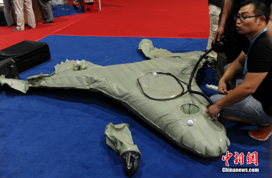 | An inflatable aircraft meets the public at Tianjin International UAV Exhibition on Aug. 29 2014. Inflatable aircraft is the aircraft without rigid skeleton. Comparing with normal aircraft, it has big load capacity, good flexibility and high impact resistance. It can be used for low speed and low altitude navigation, aerial survey and remote sensing. (CNS/Chen Haifeng) |
