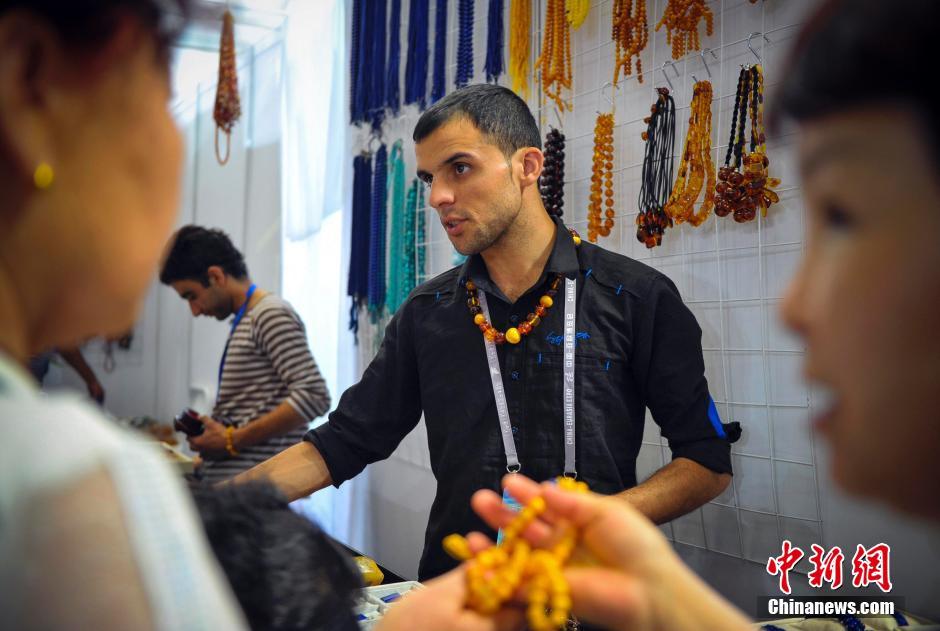 A man is promotes gems behind the booth of Afghanistan, Sept. 2nd, 2014. (Chinanews/Liu Xin)