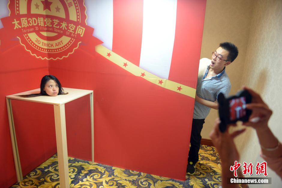People experience the 3D illusion Art Space in Taiyuan, north China’s Shanxi province on Sept. 2, 2014. All the works exhibited were designed and created by graduates in Academy of Fine Arts of Shanxi University.