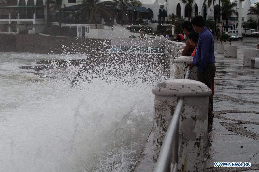 | People look the high waves caused by hurricane "Norbert", in the boardwalk of Mazatlan Port, in Sinaloa State, northwest Mexico, on Sept. 4, 2014. Hurricane "Norbert" will continue causing heavy rains in northwest and western Mexico, although it has not landed the country, the National Weather Service reported. (Xinhua/Juan Perez) |