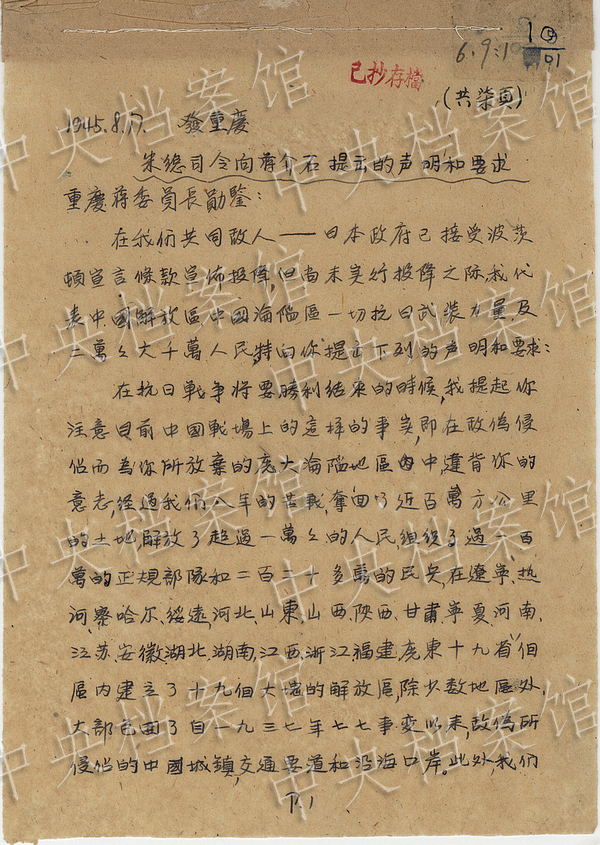 On August 25, the CPC central committee issued a declaration on the current political situation. The CPC central committee asked the Kuomingtang to designate the areas in which the Eighth Route Army, the New Fourth Army and the anti-Japanese column in south China can accept the surrender of Japan. All these requests were vetoed by the Kuomingtang government.