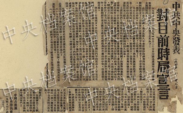 On August 25, the CPC central committee issued a declaration on the current political situation. The CPC central committee asked the Kuomingtang to designate the areas in which the Eighth Route Army, the New Fourth Army and the anti-Japanese column in south China can accept the surrender of Japan. All these requests were vetoed by the Kuomingtang government.