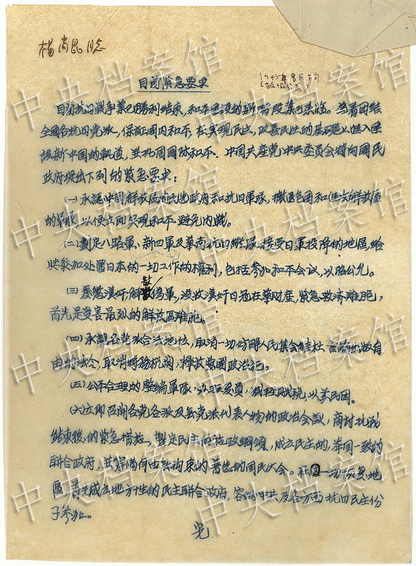 | In August 1946, the CPC central committee put forward six urgent requests to the Kuomingtang government. (Photo/China's State Archives Administration) |