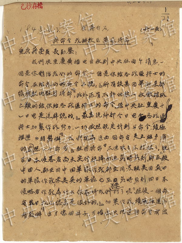 On August 25, the CPC central committee issued a declaration on the current political situation. The CPC central committee asked the Kuomingtang to designate the areas in which the Eighth Route Army, the New Fourth Army and the anti-Japanese column in south China can accept the surrender of Japan. All these requests were vetoed by the Kuomingtang government.