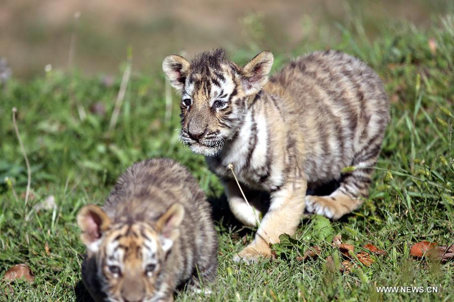 Two Siberian tiger cubs, which were born 43 days ago, frolic at Guaipo Siberian Tiger Park in Shenyang, capital of northeast China's Liaoning Province, Sept. 5, 2014. (Xinhua/Yao Jianfeng)