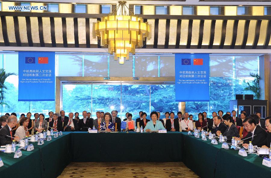 | Chinese Vice Premier Liu Yandong and European Commissioner for Education, Culture, Multilingualism and Youth Androulla Vassiliou co-chair the second meeting of China-EU High Level People-to-People Dialogue in Beijing, capital of China, Sept. 6, 2014. (Xinhua/Rao Aimin) |