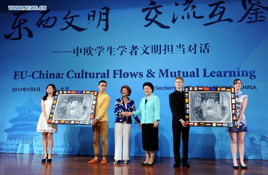 Chinese Vice Premier Liu Yandong (3rd R) and European Commissioner for Education, Culture, Multilingualism and Youth Androulla Vassiliou (3rd L), attend a forum of students and scholars of the two sides, ahead of the second meeting of China-EU High Level People-to-People Dialogue, in Beijing, capital of China, Sept. 6, 2014. (Xinhua/Rao Aimin)