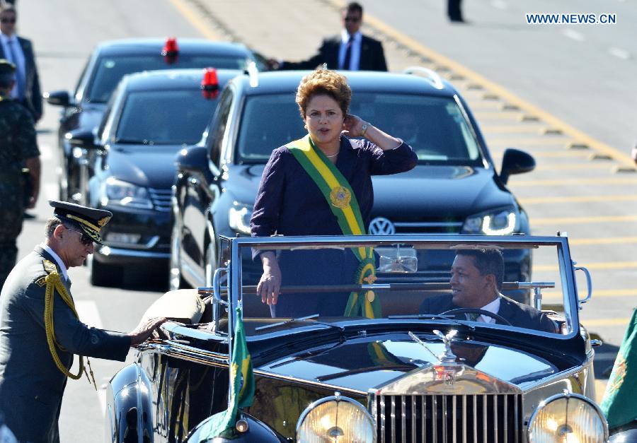 Brazilian President Dilma Rousseff (C), takes part in a military parade to commemorate the Independence's Day of Brazil, in Brasilia, Brazil, on Sept. 7, 2014. Brazil celebrates the 192th anniversary of its independence on Sunday. (Xinhua/Renato Costa/Fram/Estadao Conteudo/AGENCIA ESTADO)