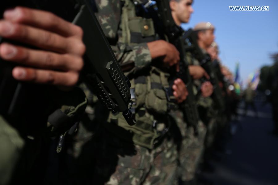 Soldiers take part in a military parade to commemorate the Independence's Day of Brazil, at the Anhembi Sambadrome, in Sao Paulo, Brazil, on Sept. 7, 2014. Brazil celebrated the 192th anniversary of its independence on Sunday. (Xinhua/Rahel Patrasso)
