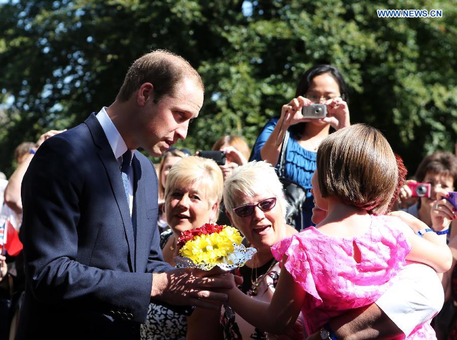 Prince William (L), Duke of Cambridge, receives flowers as he arrives to formally inaugurate the Dickson Poon University of Oxford China Centre Building in Oxford, the United Kingdom, on Sept. 8, 2014. Prince William unveiled the Dickson Poon University of Oxford China Centre here on Monday. (Xinhua/Han Yan)