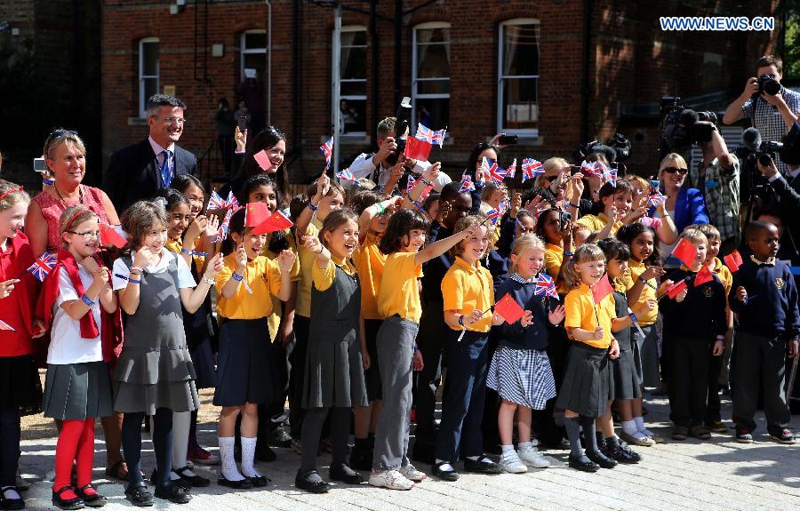 School students welcome Prince William, Duke of Cambridge, in Oxford, the United Kingdom, on Sept. 8, 2014. Prince William unveiled the Dickson Poon University of Oxford China Centre here on Monday. (Xinhua/Han Yan)