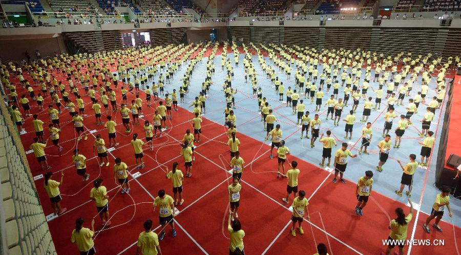 Students from 14 schools challenge the "Most People Skipping Double Dutch Simultaneously Guinness World Record" at the Hsinchuang Stadium in Xinbei City, southeast China's Taiwan, Sept. 9, 2014. The Guinness world record for the most people skipping double dutch style was achieved by 597 participants at the event to promote physical education Tuesday. (Xinhua/Wang Qingqin)