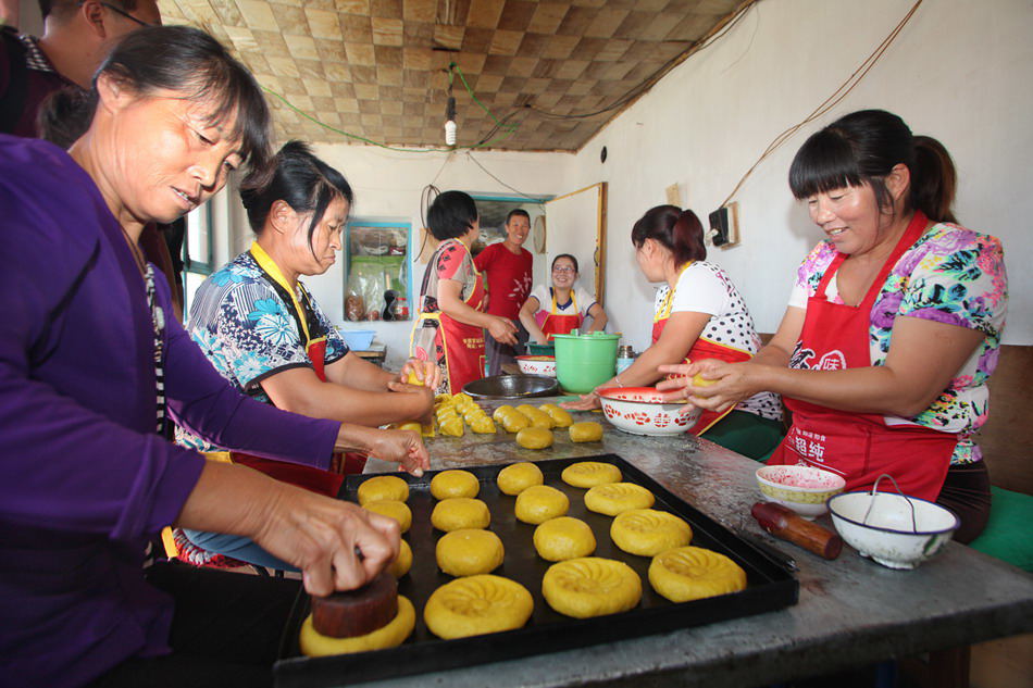 Villagers apply the traditional crafts to make moon cakes at Caijiazhuang, north China’s Hebei Province. (Xinhua/ Wu Diansen)