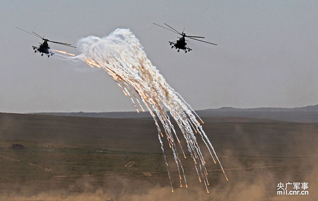 Helicopters launch accurate strikes on enemy’s ground targets in Peace Mission 2014, a joint anti-terror military drill conducted by forces of the Shanghai Cooperation Organization (SCO) countries. (Photo/mil.cnr.cn)