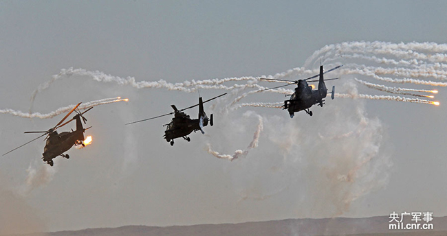 Helicopters launch accurate strikes on enemy’s ground targets in Peace Mission 2014, a joint anti-terror military drill conducted by forces of the Shanghai Cooperation Organization (SCO) countries. (Photo/mil.cnr.cn)