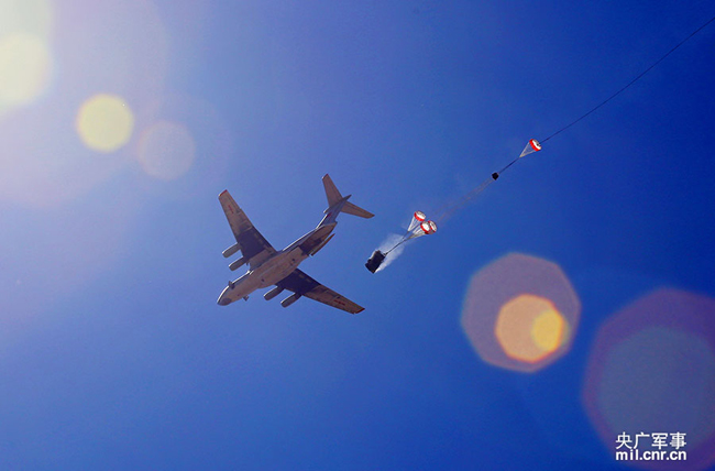 Chinese transport aircraft launches airborne fighting vehicle to the battleground in Peace Mission 2014, a joint anti-terror military drill conducted by forces of the Shanghai Cooperation Organization (SCO) countries. (Photo/mil.cnr.cn)