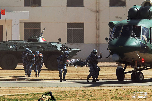 A severely injured hostage is rushed to the helicopter in Peace Mission 2014, a joint anti-terror military drill conducted by forces of the Shanghai Cooperation Organization (SCO) countries. (Photo/mil.cnr.cn)