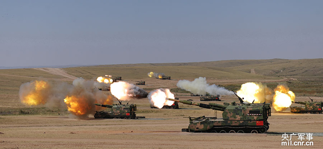 Chinese artillery group launches strikes against critical targets in Peace Mission 2014, a joint anti-terror military drill conducted by forces of the Shanghai Cooperation Organization (SCO) countries. (Photo/mil.cnr.cn)