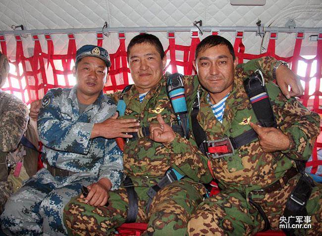 | Kazakhstan airborne combatants invite their Chinese counterparts for aircraft visit in Peace Mission 2014, a joint anti-terror military drill conducted by forces of the Shanghai Cooperation Organization (SCO) countries. (Photo/mil.cnr.cn) |