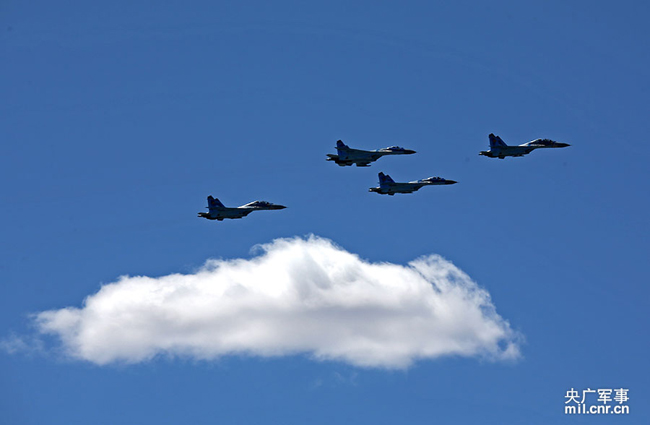 Four Russian Su-27 fighters in a military parade of Peace Mission 2014, a joint anti-terror military drill conducted by forces of the Shanghai Cooperation Organization (SCO) countries. (Photo/mil.cnr.cn)