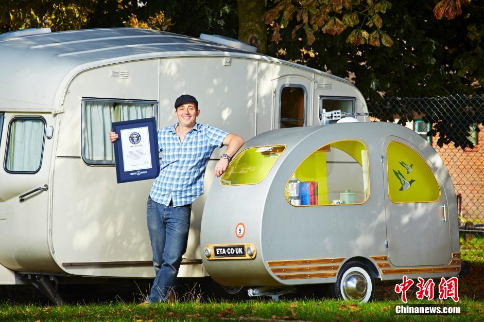| Londoner Yannick Read made his niche in the Guinness World Records 2015 book by building the world’s smallest caravan. The vehicle, which is fully roadworthy, measures 2.39m in length, 1.53m high and 0.79m wide. (Photo: Xinhuanet photo/Chinanews.com) |