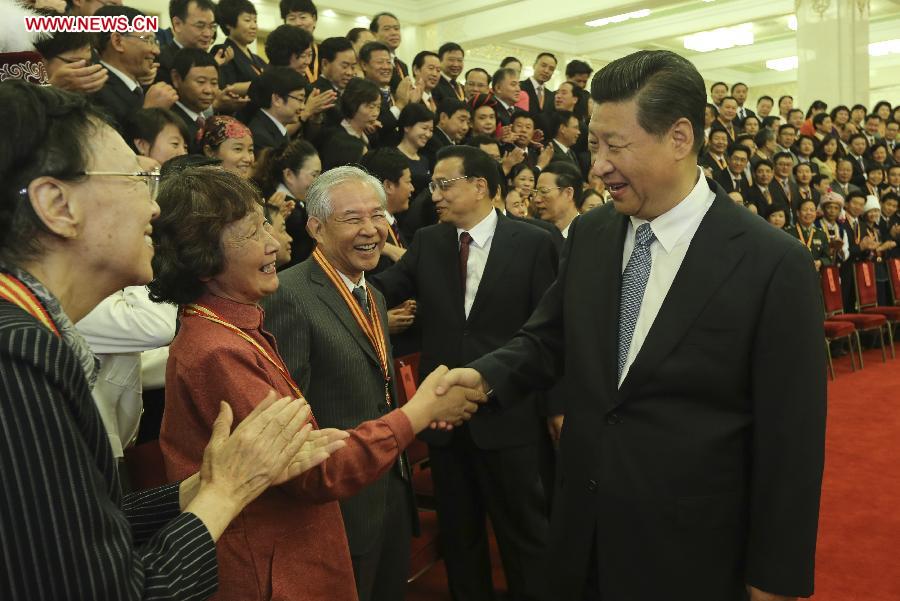 Chinese President Xi Jinping, together with other senior leaders including Li Keqiang, Liu Yunshan and Zhang Gaoli, meets and congratulates award winning teachers at a ceremony celebrating the upcoming Teacher's Day in Beijing, capital of China, Sept. 9, 2014. (Xinhua/Lan Hongguang)