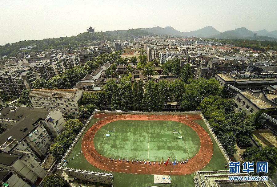Hangzhou Wahaha Primary School took PE lesions on the outdoor playground on the roof.(Xinhua/Xu Yu)