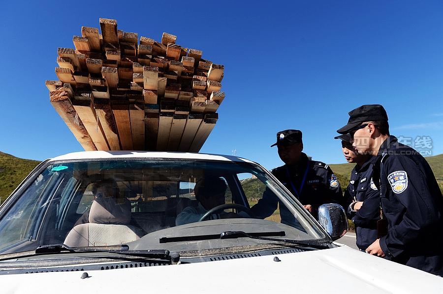 Policemen check the timber transporting wagons. (www.scol.com.cn)