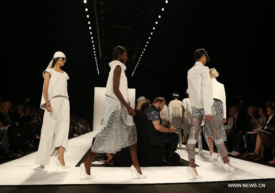 A model presents a creation by designers from Academy of Art University during the 2015 New York Fashion Week in New York, the United States, on Sept. 6, 2014. (Xinhua/Qin Lang)
