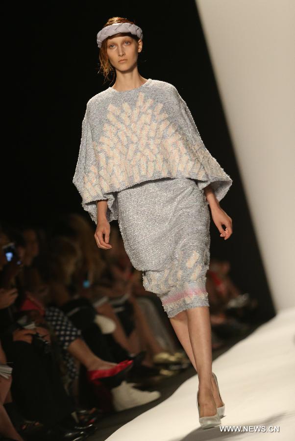 | A model presents a creation by designers from Academy of Art University during the 2015 New York Fashion Week in New York, the United States, on Sept. 6, 2014. (Xinhua/Qin Lang) |