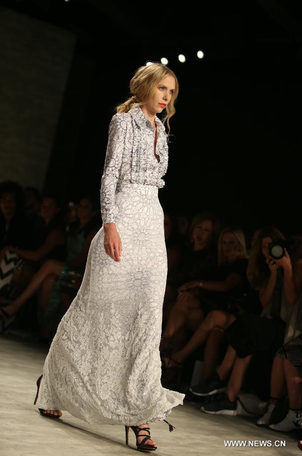 A model presents a creation of the Spring/Summer 2015 LUIS ANTONIO collection during the New York Fashion Week in New York, the United States, Sept. 6, 2014. (Xinhua/Qin Lang)