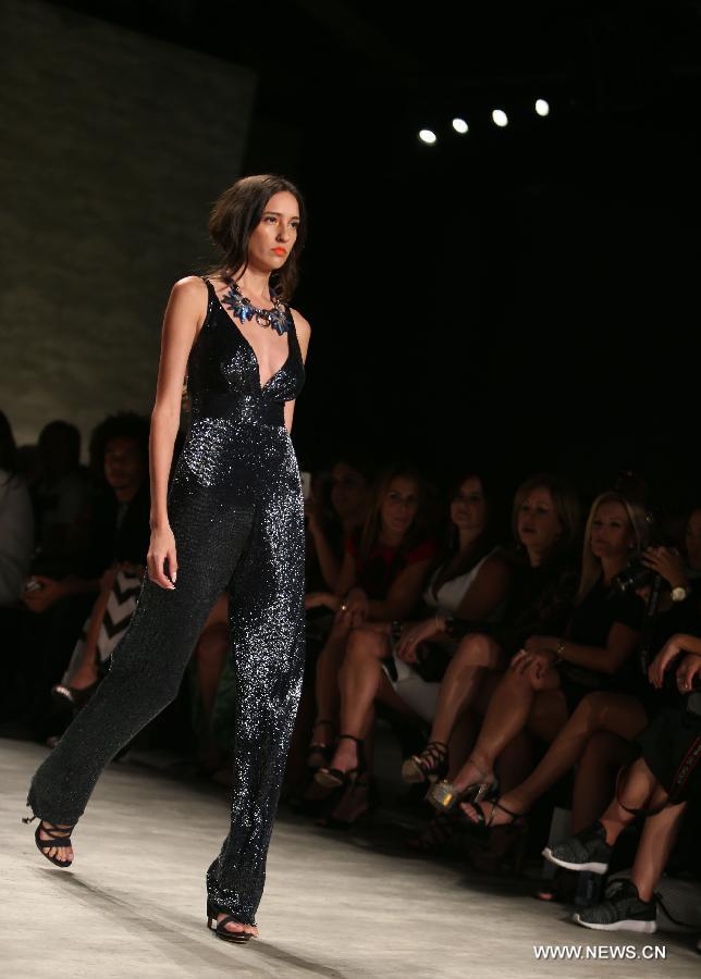 A model presents a creation of the Spring/Summer 2015 LUIS ANTONIO collection during the New York Fashion Week in New York, the United States, Sept. 6, 2014. (Xinhua/Qin Lang)