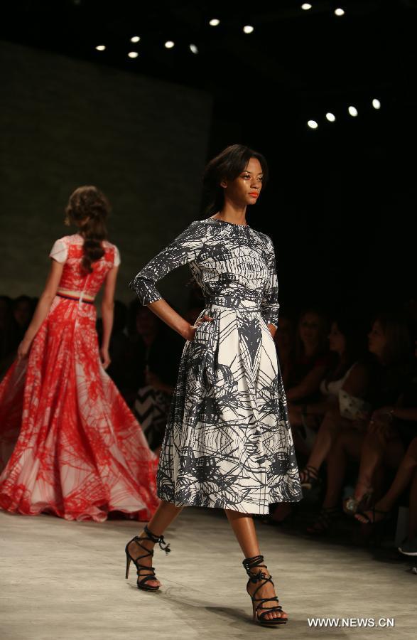 A model presents a creation of the Spring/Summer 2015 LUIS ANTONIO collection during the New York Fashion Week in New York, the United States, Sept. 6, 2014. (Xinhua/Qin Lang)
