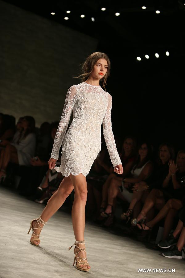 A model presents a creation of the Spring/Summer 2015 LUIS ANTONIO collection during the New York Fashion Week in New York, the United States, Sept. 6, 2014. (Xinhua/Qin Lang)