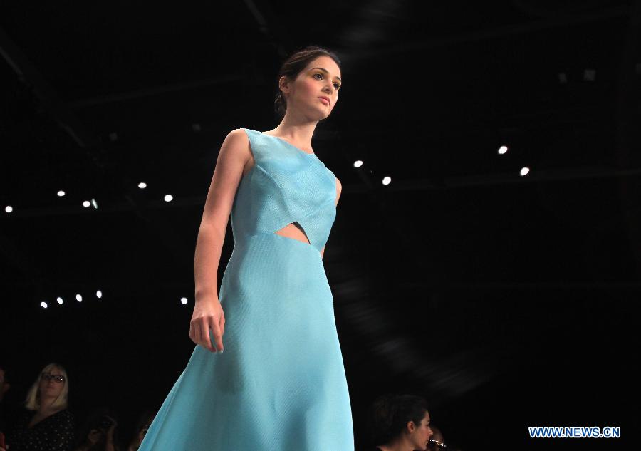 A Model presents a creation of the Spring/Summer 2015 ANGEL SANCHEZ collection during the New York Fashion Week in New York, the United States, Sept. 8, 2014. (Xinhua/Cheng Li)
