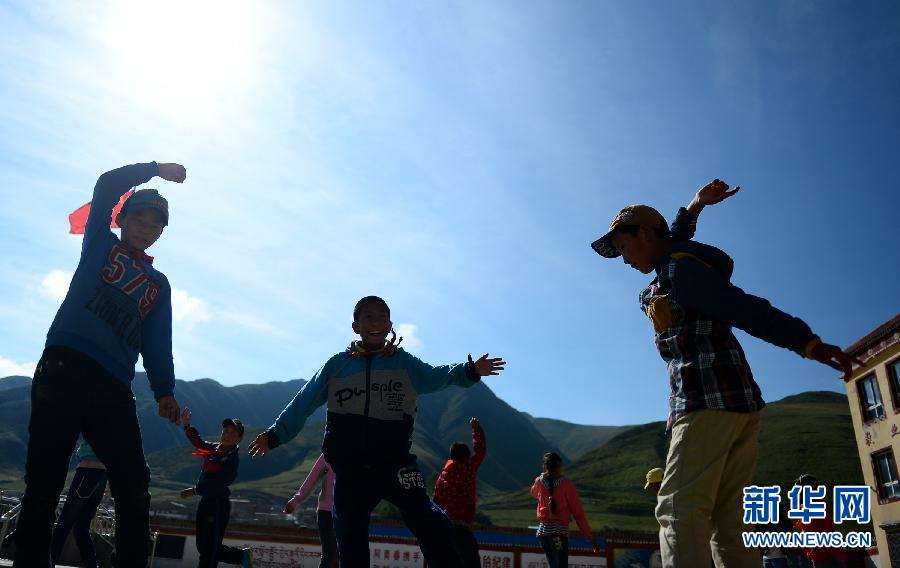 Students perform folk dances at Jiujia Elementary School in Labrang town of Xiahe county, northwest China's Gansu province on Sept. 2, 2014. (Xinhua News Agency/Zhang Meng)