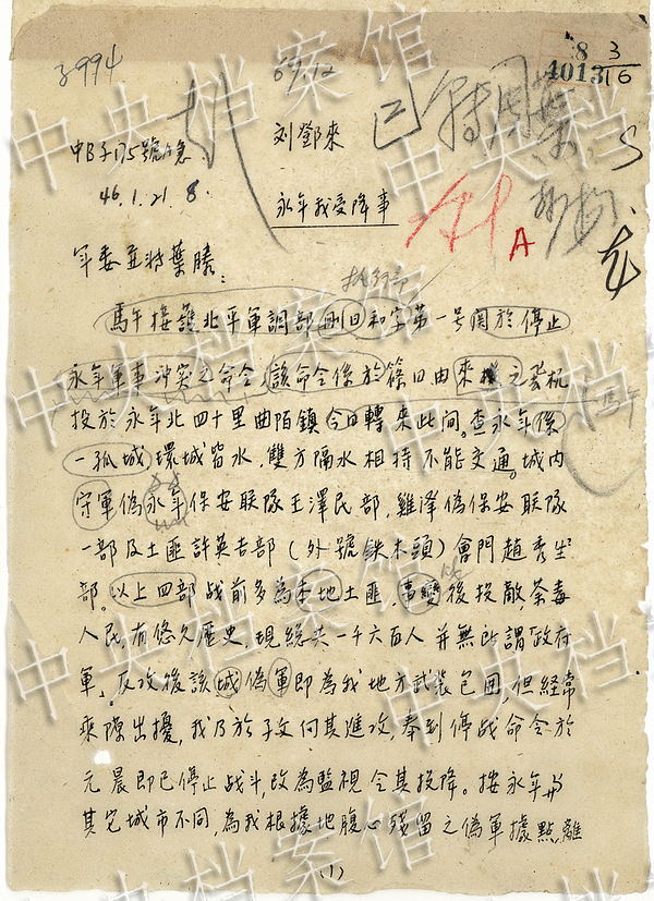 On January 21, 1946, Liu Bocheng, Deng Xiaoping and Li Da said that the Japanese troops in Yuanshi County, Qinzhou and Liaocheng County should surrender to the anti-Japanese forces led by the CPC as these troops had been besieged by them in a telegram to the Central Military Commission of the CPC. The telegram was also sent to Zhou Enlai and Ye Jianying. (Photo/China's State Archives Administration)