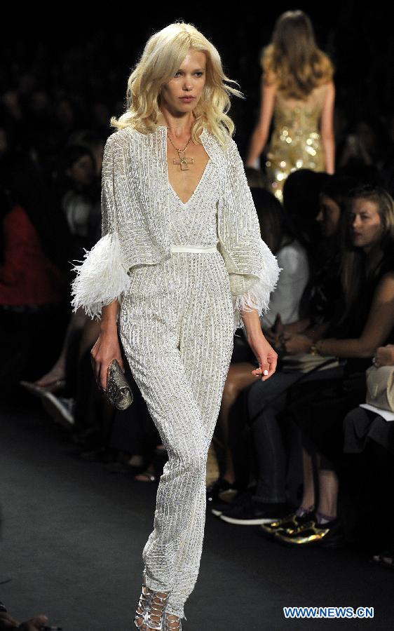 A model displays a creation of Naeem Khan Spring 2015 collection during the New York Fashion Week in New York, the United States, on Sept. 9, 2014. (Xinhua/Wang Lei)