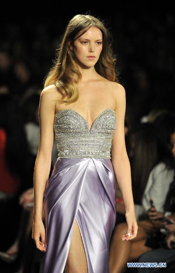 A model displays a creation of Naeem Khan Spring 2015 collection during the New York Fashion Week in New York, the United States, on Sept. 9, 2014. (Xinhua/Wang Lei)