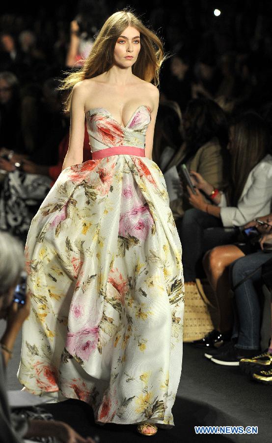 A model displays a creation of Naeem Khan Spring 2015 collection during the New York Fashion Week in New York, the United States, on Sept. 9, 2014. (Xinhua/Wang Lei)