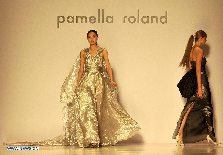 Models present creations of the Spring/Summer 2015 Pamella Roland collection during the New York Fashion Week in New York, the United States, on Sept. 9, 2014. (Xinhua/Wang Lei)