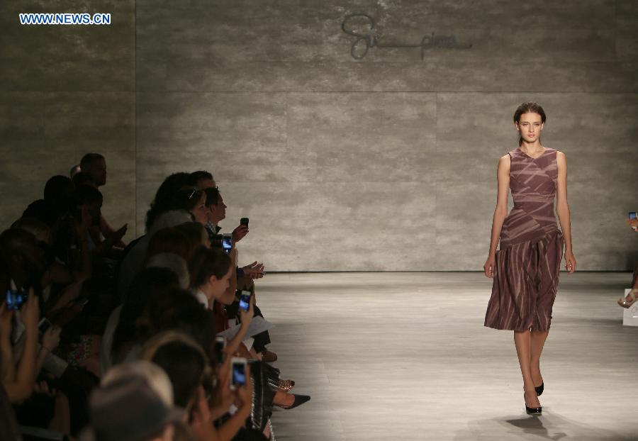 A model presents a creation of the Spring/Summer 2015 SUPIMA collection during the New York Fashion Week in New York, the United States, Sept. 4, 2014. The Mercedes-Benz Fashion Week Spring 2015 opened here on Thursday. (Xinhua/Qin Lang)