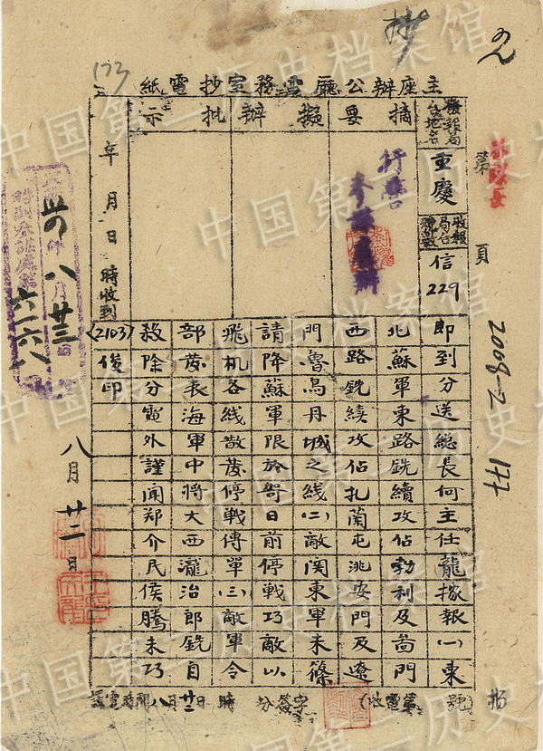 From August 18 to September 2, 1945, Zheng Jiemin and other officers had been giving an account of the negotiations on the surrender of Japanese army in the telegrams to the chairman of Military Affairs Commission.(Photo/Second Historical Archives of China)